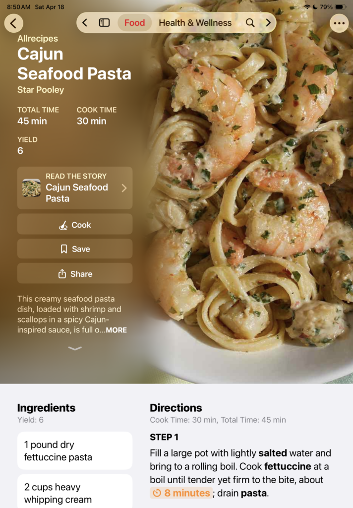 A hidden gem of the MacOS/iOS ecosystem that doesn’t get nearly enough credit is the almost hidden recipes database. In the News app sidebar, go to Food, then Recipe Catalog. They reformat tens of thousands of recipes from dozens of recipe sites and format them in a consistent way, with exactly the same layout and no embedded nonsense – just the stuff you need to know. Perfect for cooking with an iPad open, and you can save favorite recipes to your personal catalog.